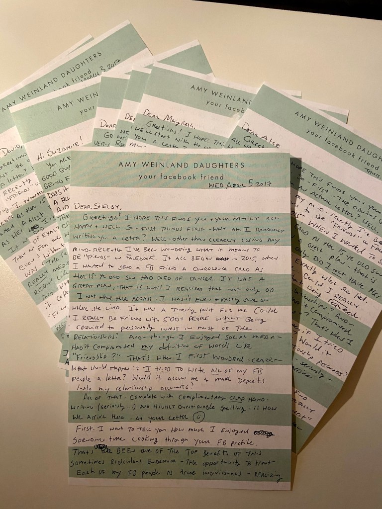 I’m so excited to have my first guest post of the year share a little bit about her experience with social media. Amy Weinland Daughters is an author who is coming out with a book on May 17, 2022 called “Dear Dana: That Time I Went Crazy and Wrote All 580 of my Facebook Friends a Handwritten Letter.” When I first heard about this book, the first thing I said to my husband was “that sounds like my kind of book!” Many of you know how much I love handwritten letters, so I can’t wait to read Amy’s book! In the meantime, I hope you enjoy her post about how social media can connect and disconnect us below.
